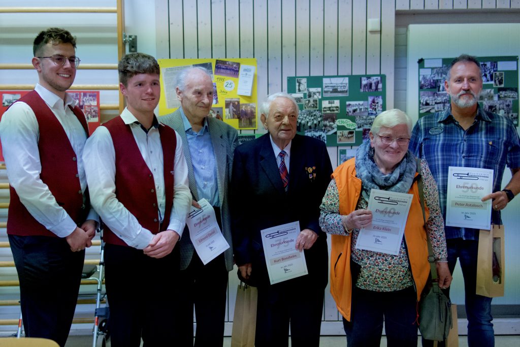 Andreas Frank durfte dann für den Blasmusikverband Karlsruhe gleich mehrere Aktive für ihr langjähriges Engagement auszuzeichnen: So ging die Verbandsehrennadel in Bronze für zehn Jahre aktives Musizieren an Valery Keppler, die Ehrennadel in Silber für 20 Jahre Aktivität an Janine Landauf, Robin Springer und Sebastian Kreiter. Frank betonte das herausragende Engagement aller Geehrten. Dieses umfasse nicht nur jahrelanges, zeitintensives Musizieren und Üben – vielmehr seien alle Geehrten auch außermusikalisch für den Musikverein aktiv.